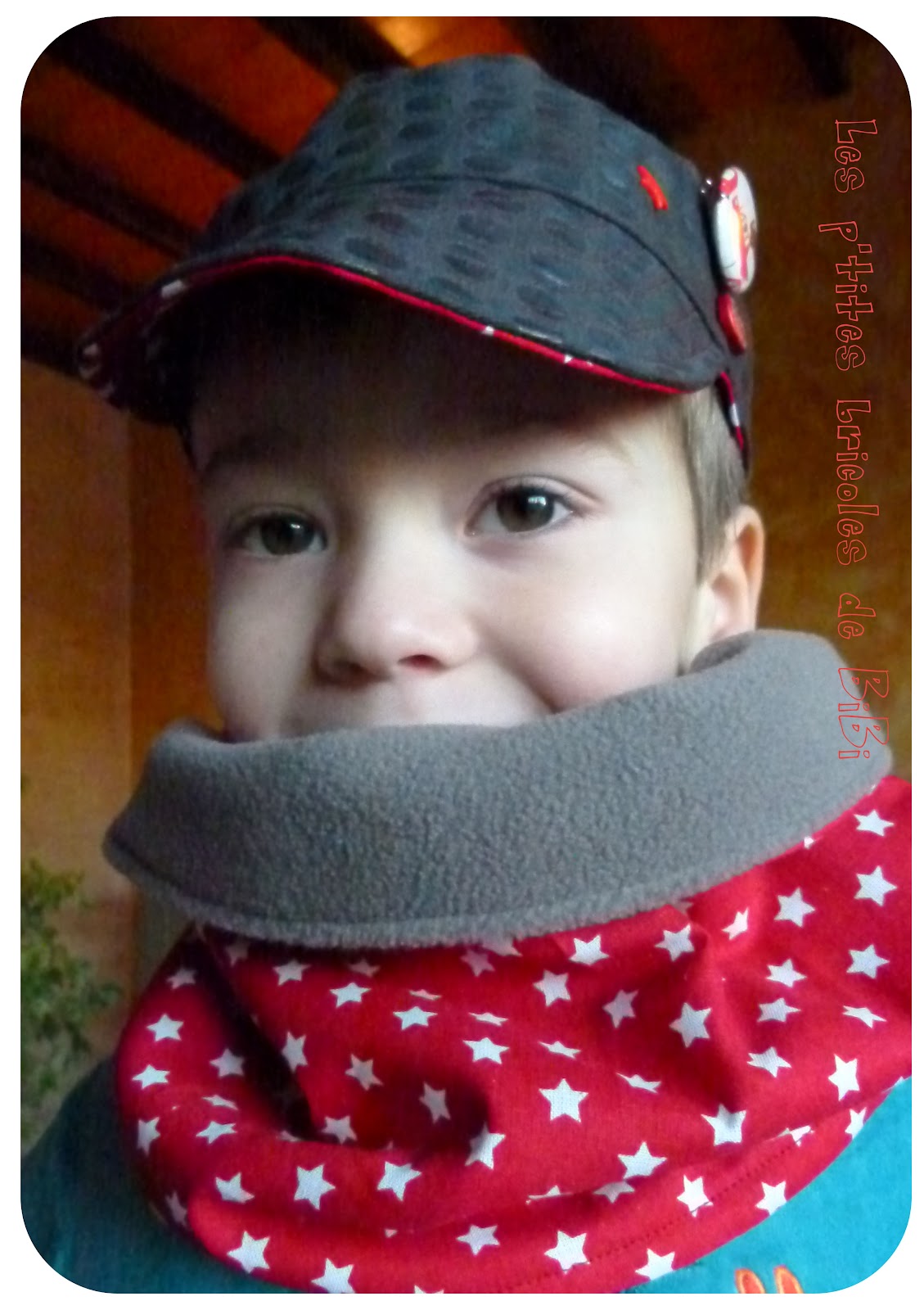 La casquette des Irrésistibles à coudre portée par mon grand avec son snood assorti